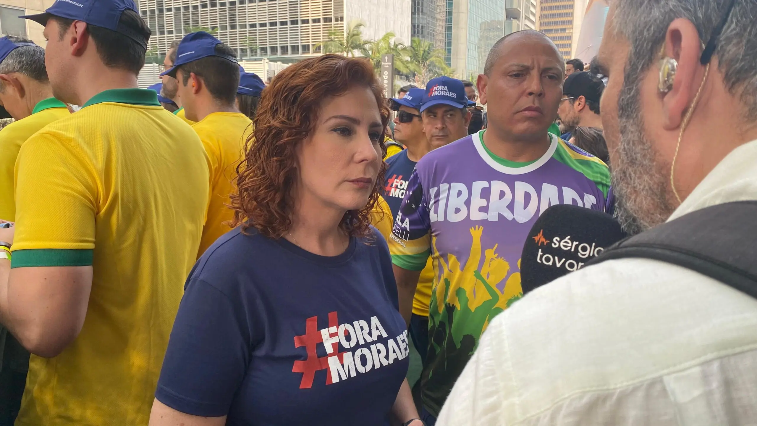 A deputada federal Carla Zambelli (PL-SP) concede entrevista durante ato da Paulista. FOTO: Luisa Purchio/Gazeta do Povo (Foto: | Luisa Purchio / Gazeta do Povo)