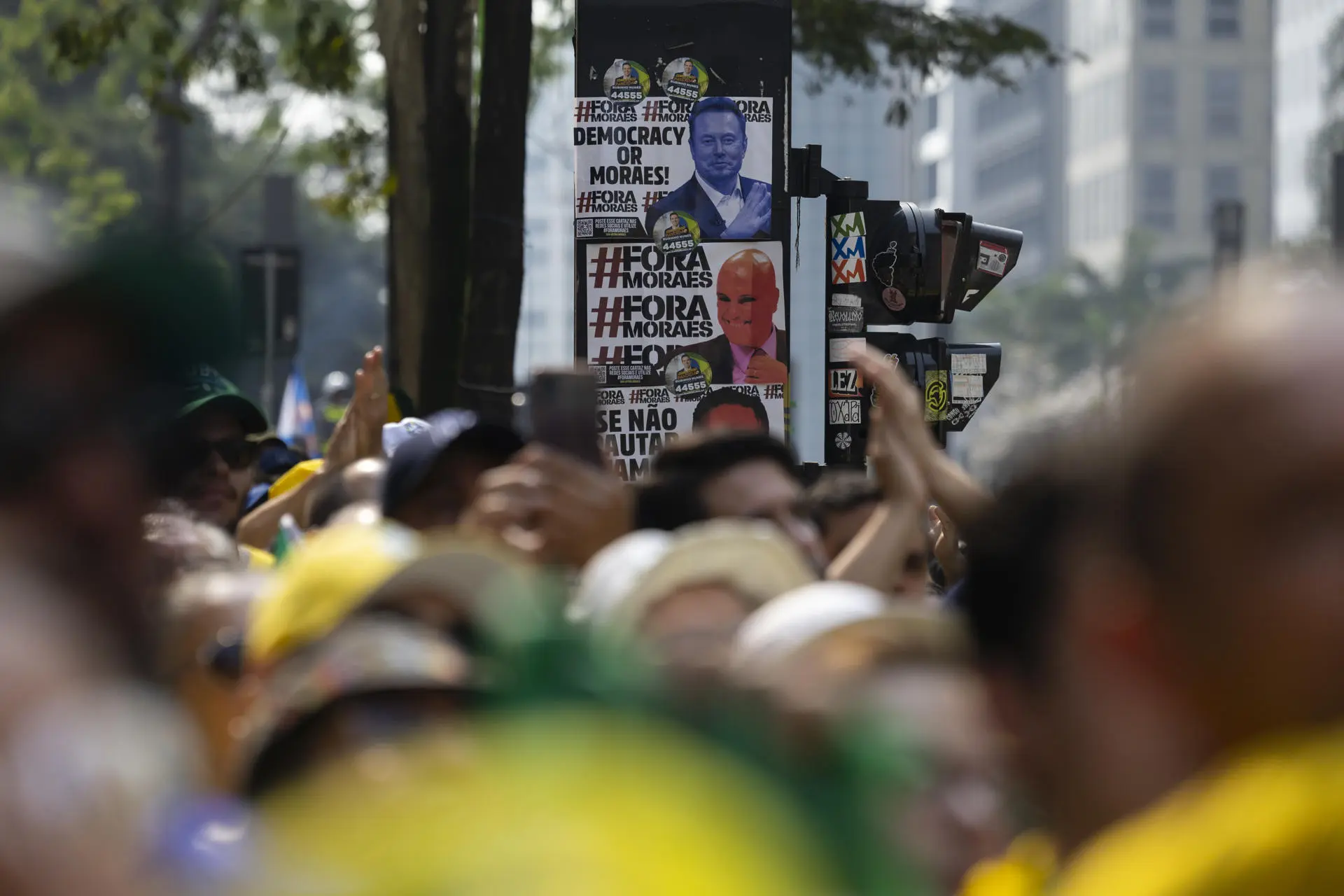 Cartazes de "Fora Moraes" e em "Democracy or Moraes" foram vistos na manifestação de 7 de setembro, na Avenida Paulista. FOTO: EFE/ Isaac Fontana (Foto: EFE)