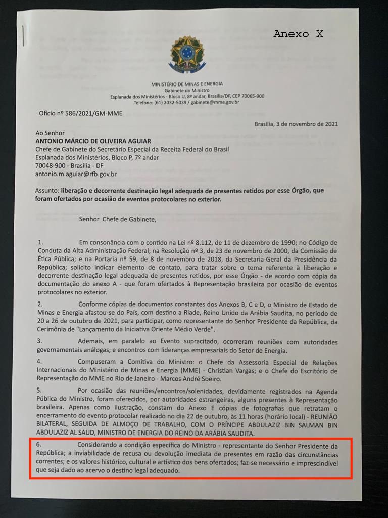 Para corroborar a afirmação, Wajngarten publicou um ofício do Ministério de Minas e Energia, emitido em 3 de novembro de 2021 – uma semana após a apreensão das peças – direcionado à Receita Federal, que pede a liberação dos itens dando a entender que seriam direcionados ao acervo, passando a ser propriedade do Estado brasileiro.