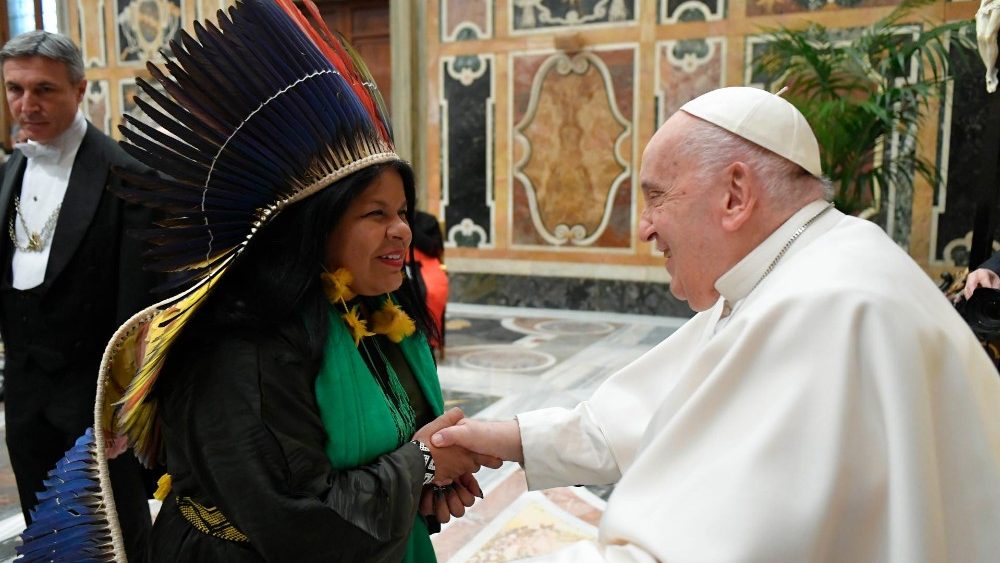 Nesta quinta-feira (14), a ministra dos Povos Indígenas, Sonia Guajajara, se encontrou com o Papa Francisco, no Vaticano. O encontro aconteceu durante a realização de uma audiência promovida pelas Pontifícias Academias de Ciências e Ciências Sociais, que teve como tema: "Conhecimento dos povos indígenas e as ciências".