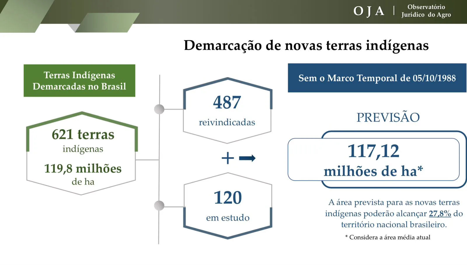 No total, essas novas terras equivalem a cerca de 117 milhões de hectares que, somados aos 119 milhões já destinados aos indígenas, chegariam a 27,8% de todo o território brasileiro, segundo o Observatório Jurídico do Agro.