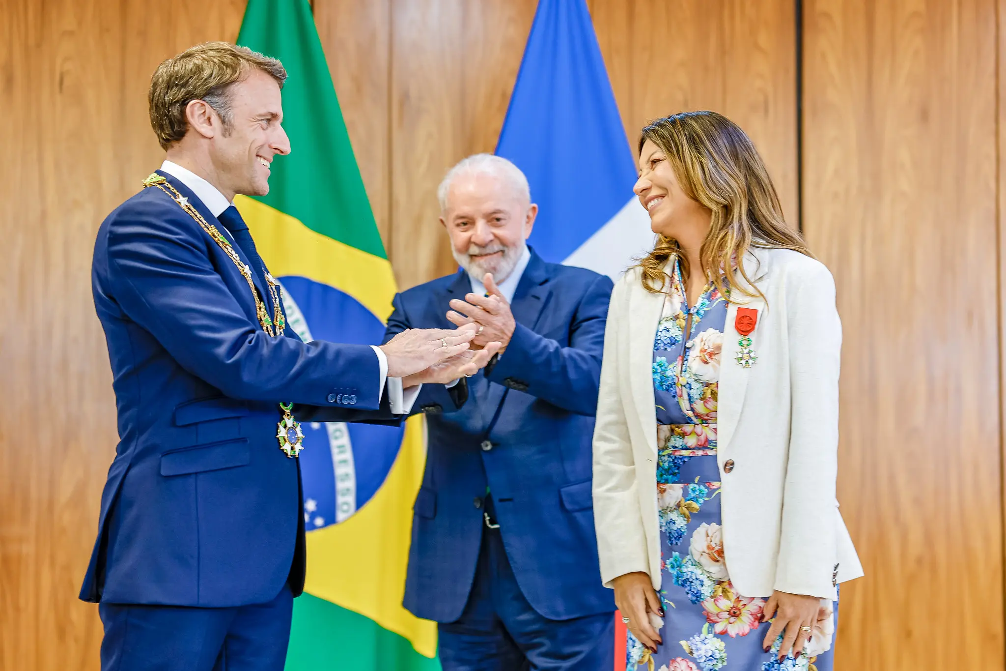 Com a chegada de Macron, no entanto, mesmo desacompanhado, Janja se aproximou do líder francês para cumprimentá-lo com um abraço e beijos no rosto. A primeira-dama também parou para posar para uma foto ao lado de Lula e o presidente da França.