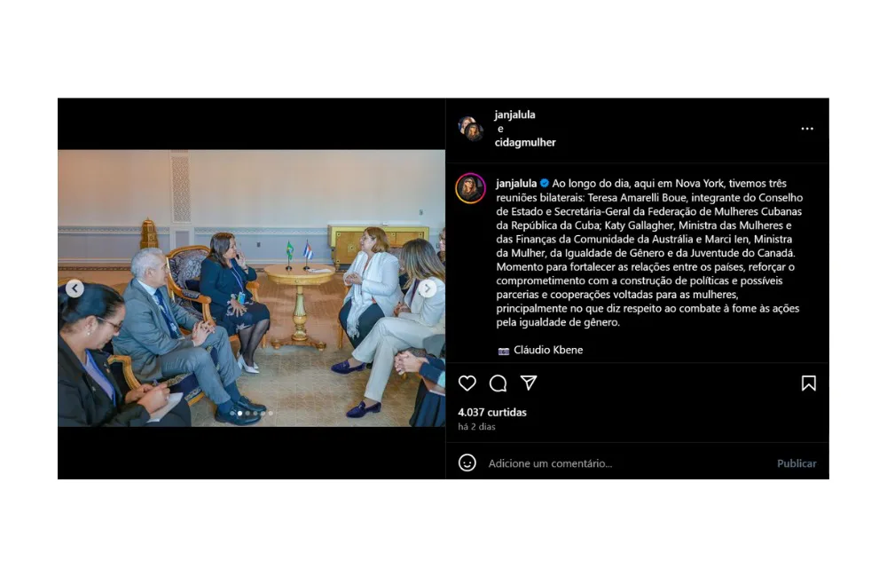 “Ao longo do dia, aqui em Nova York, tivemos três reuniões bilaterais: Teresa Amarelli Boue, integrante do Conselho de Estado e Secretária-Geral da Federação de Mulheres Cubanas da República da Cuba; Katy Gallagher, Ministra das Mulheres e das Finanças da Comunidade da Austrália e Marci Ien, Ministra da Mulher, da Igualdade de Gênero e da Juventude do Canadá. Momento para fortalecer as relações entre os países, reforçar o comprometimento com a construção de políticas e possíveis parcerias e cooperações voltadas para as mulheres, principalmente no que diz respeito ao combate à fome, às ações pela igualdade de gênero”, escreveu Janja em seu perfil no Instagram, nesta quinta-feira (14).