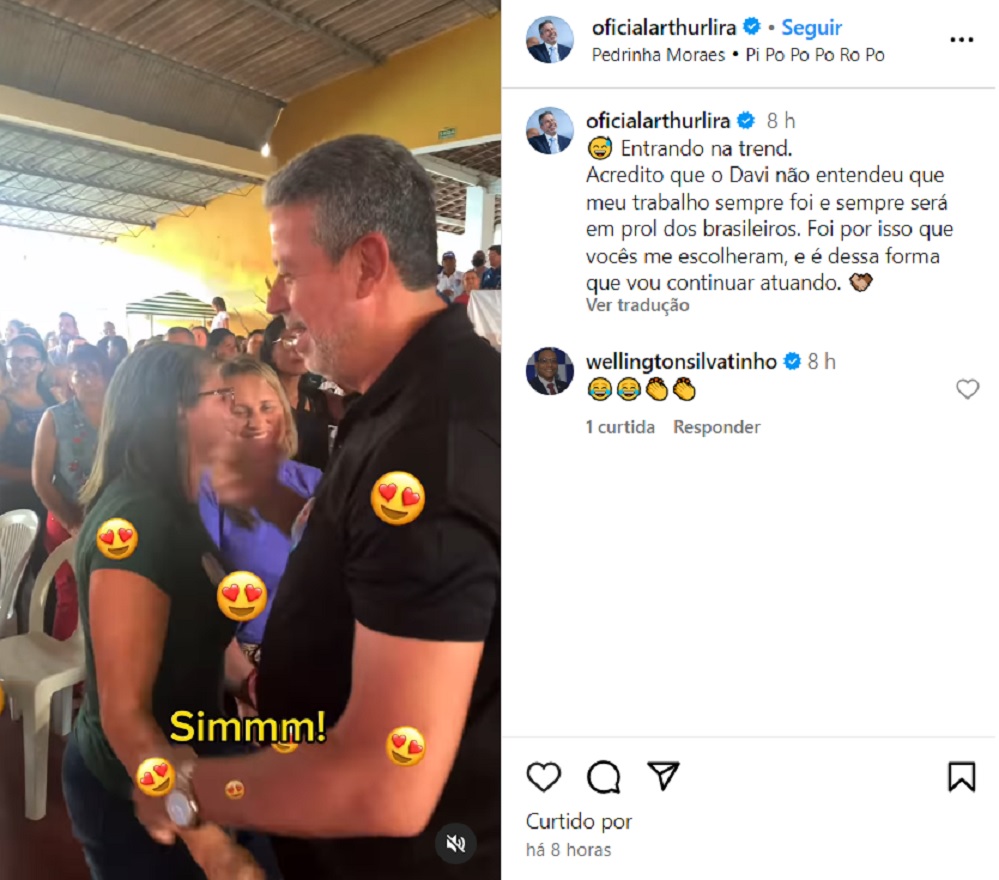 Na sequência, Lira digita uma mensagem que explica a ideia: “Entrando na trend. Acredito que o Davi não entendeu que meu trabalho sempre foi e sempre será em prol dos brasileiros. Foi por isso que vocês me escolheram, e é dessa forma que vou continuar atuando”.
