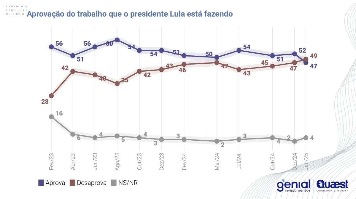 De acordo com a Quaest, a desaprovação a Lula superou a aprovação pela primeira vez, 49% a 47%, respectivamente, mas com um empate técnico dentro da margem de erro de 1 ponto percentual: