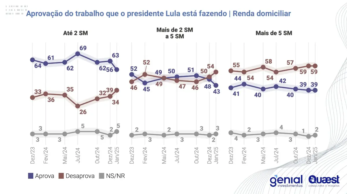 Segundo a Quaest, Lula vem perdendo popularidade principalmente entre os eleitores do Nordeste, sua principal base eleitoral, e entre as pessoas de renda mais baixa. Apenas na região do país que costuma ser mais fiel e apoiadora, o presidente perdeu 8 pontos de aprovação, e mais 7 pontos entre os brasileiros que ganham até dois salários mínimos.