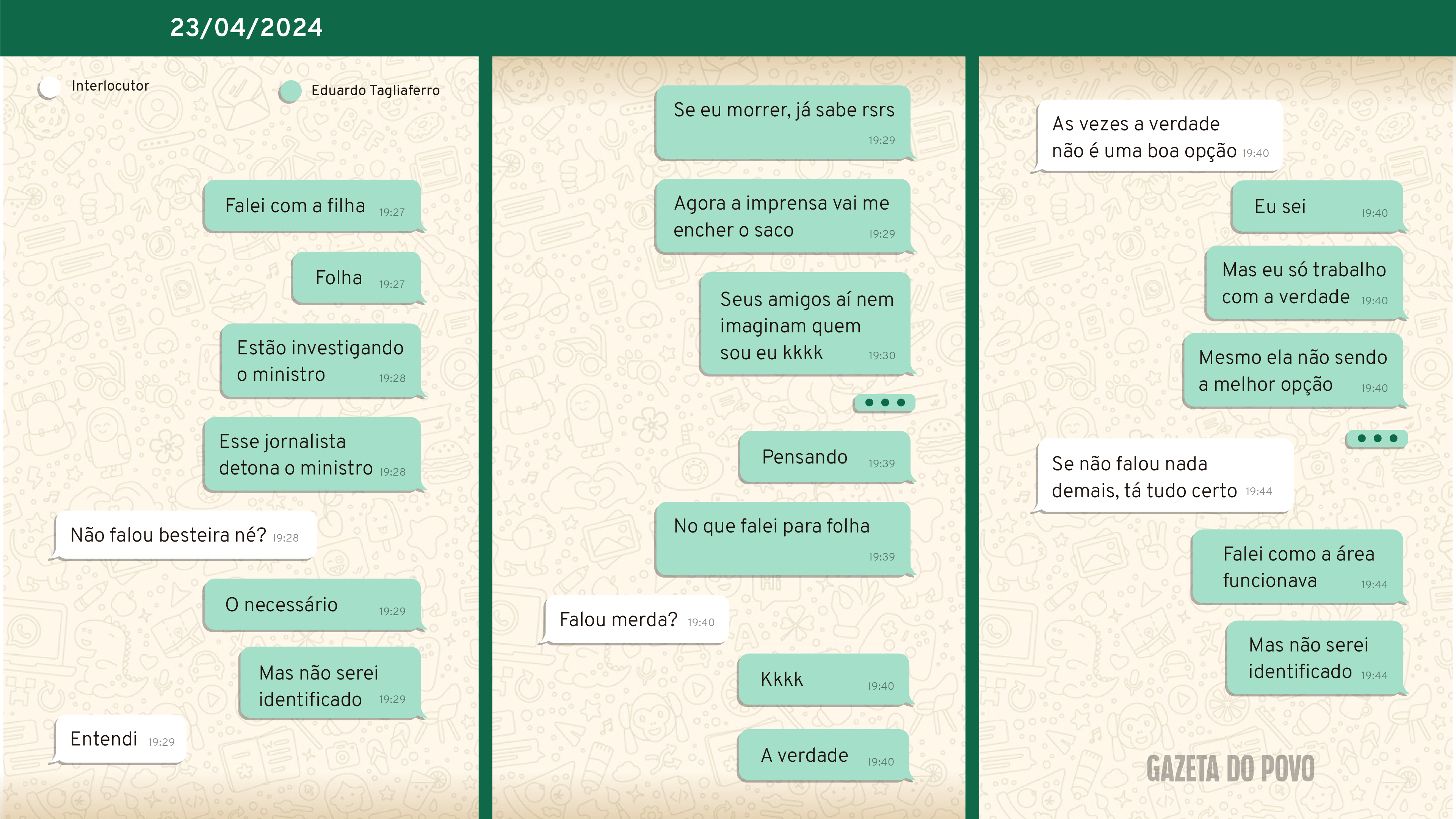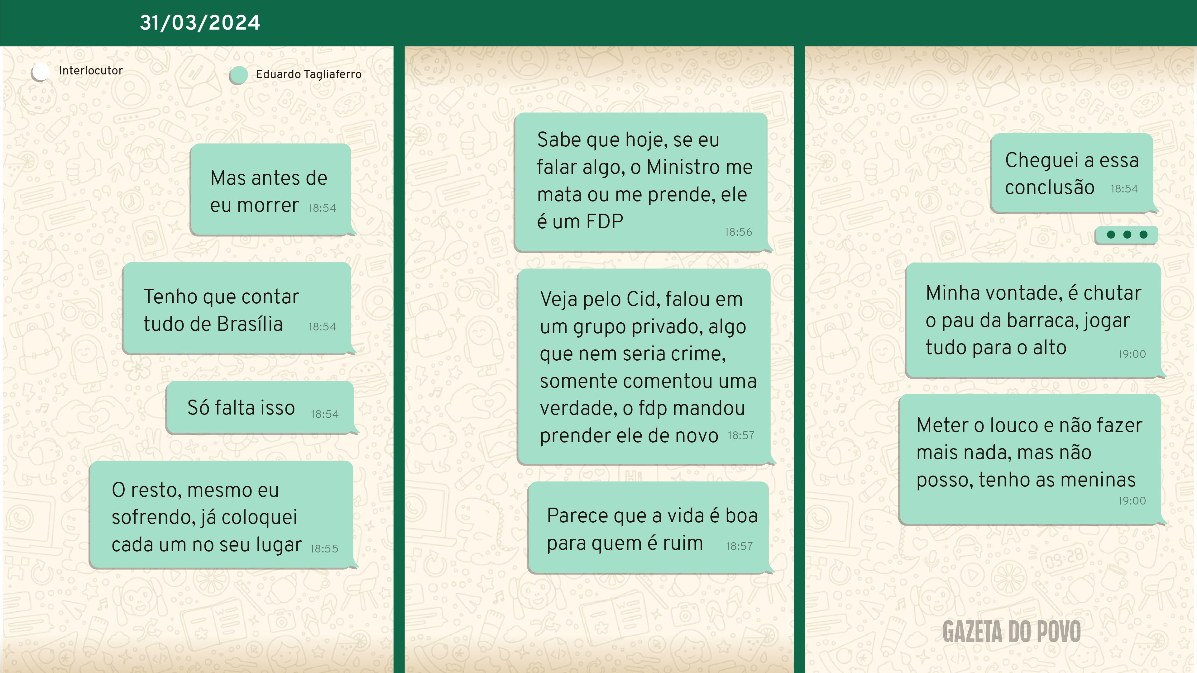 As mensagens, inéditas, foram capturadas pela Polícia Federal no inquérito contra Tagliaferro que tramita no Supremo Tribunal Federal (STF). A Gazeta do Povo acessou o histórico de conversas dele com a mulher pelo WhatsApp a partir de um relatório oficial da investigação. O inquérito é público e o documento pode ser acessado por qualquer pessoa cadastrada no sistema de consulta processual do STF.