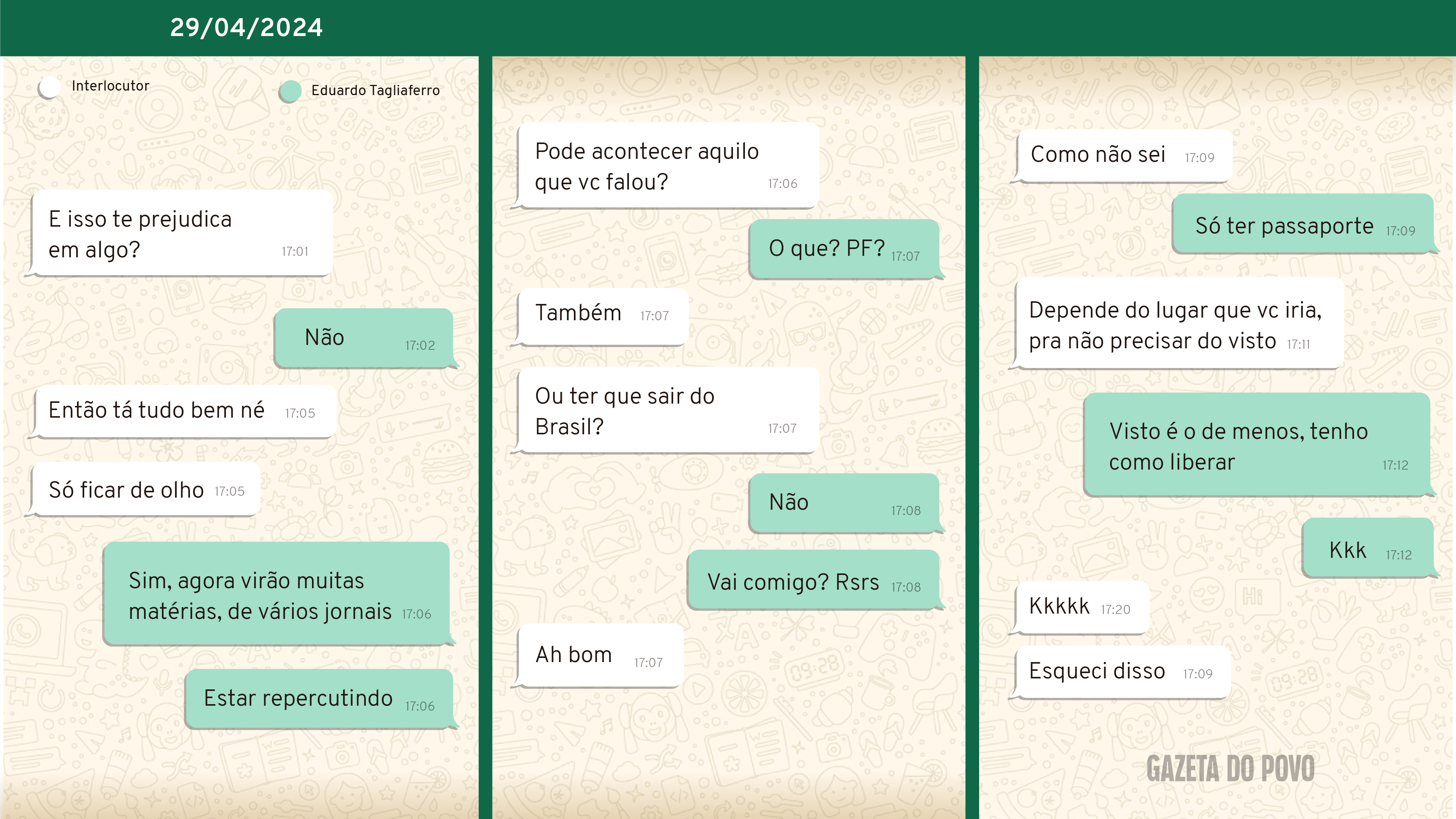 Ela perguntou se a publicação da reportagem poderia prejudicá-lo. Ele respondeu que não, mas depois ela indagou se ele “poderia ter que sair do Brasil”. Tagliaferro então rejeitou essa possibilidade: “Não”. Em outros trechos do diálogo, ele voltou a tratar do assunto com a mulher.