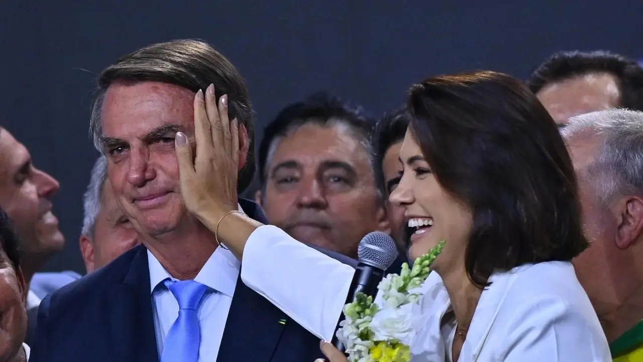 Michelle Bolsonaro sorrindo segurando um microfone enquanto encosta a mão esquerda no rosto do marido Jair Bolsonaro que dá um leve sorriso sem mostrar os dentes.