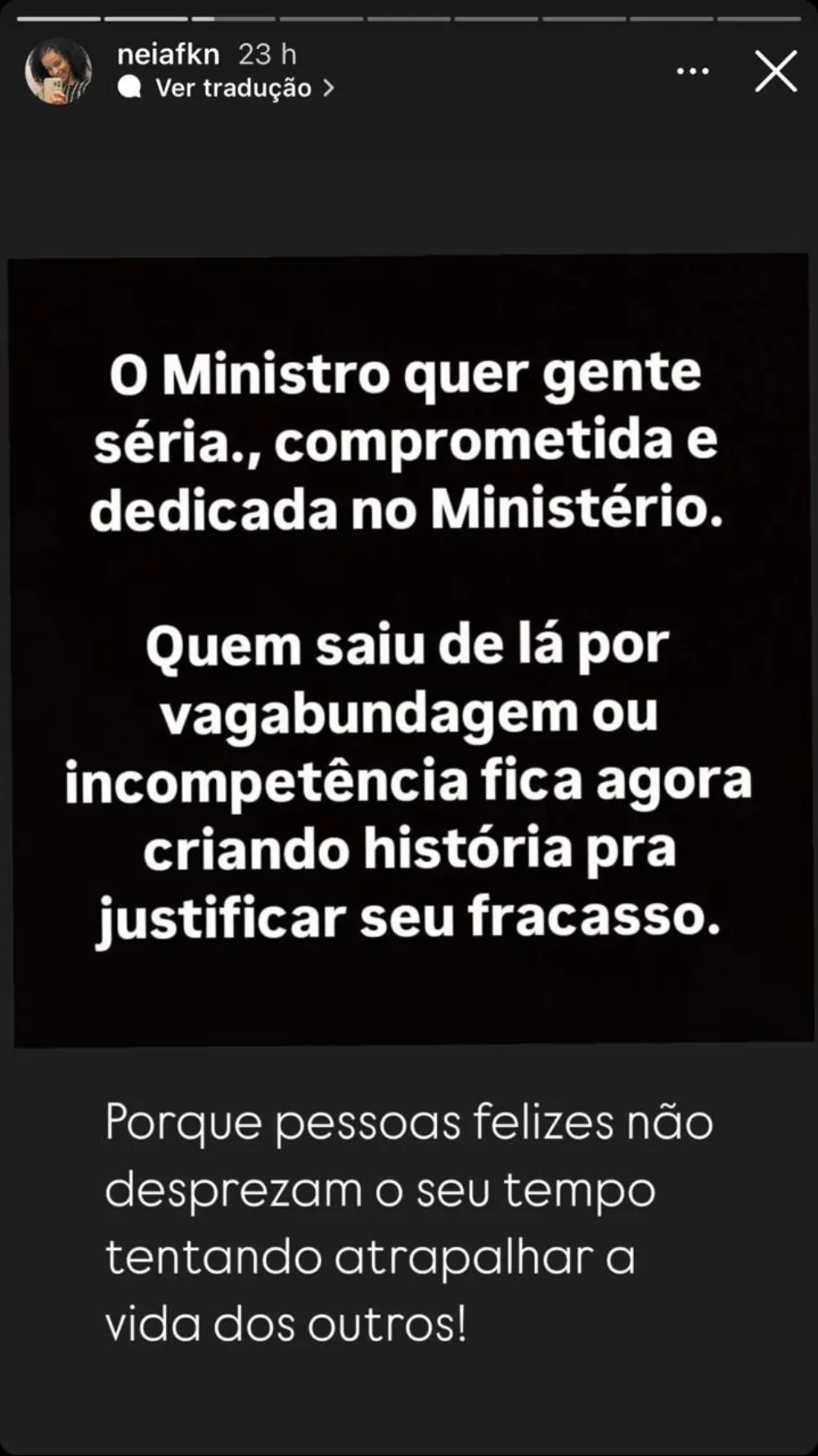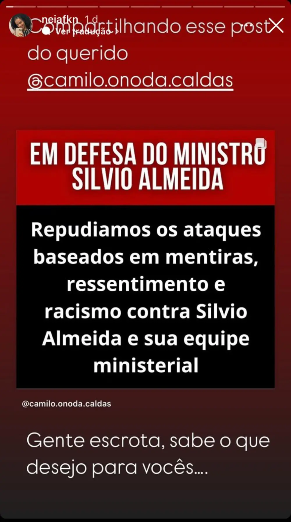 Em uma série de postagens em uma rede social na noite desta quinta (5), Ednéia saiu em defesa de Almeida repudiando o que classifica como “ataques baseados em mentiras, ressentimento e racismo” contra ele e “sua equipe ministerial”. “Gente escrota”, emendou em uma das postagens nos Stories do Instagram (veja na íntegra mais abaixo).