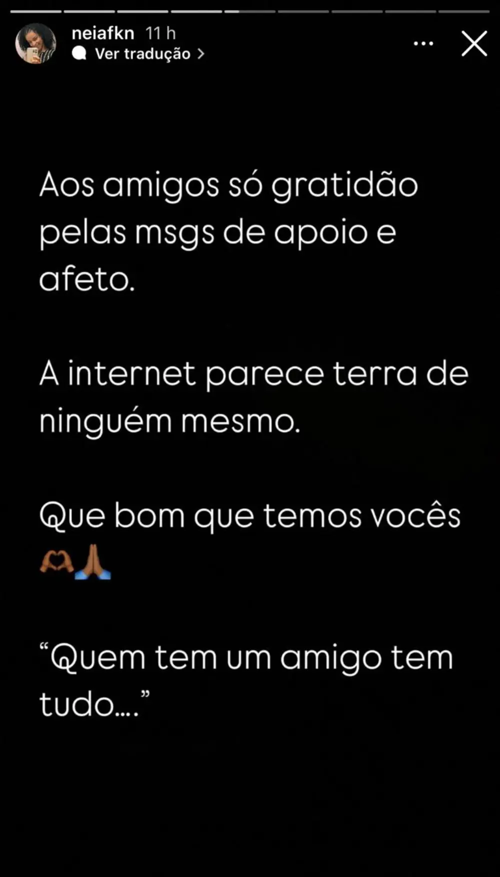 Veja abaixo a íntegra das mensagens postadas por Ednéia Carvalho nos Stories do Instagram: