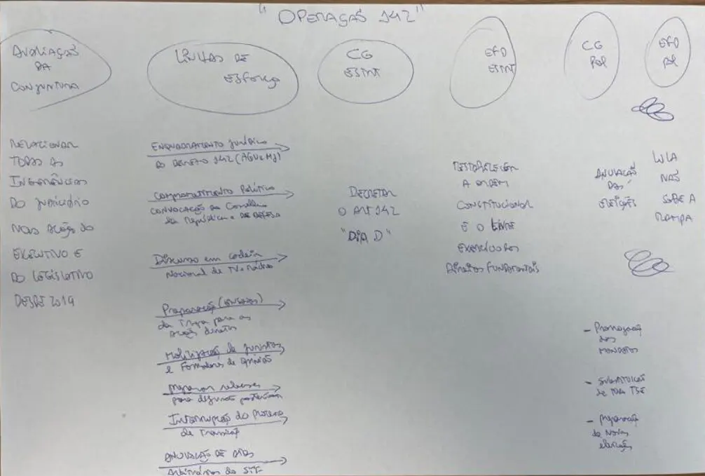O manuscrito obtido pelos investigadores mostra o planejamento para “decretar” o “Dia D” com base no artigo 142, interpretado erroneamente como uma ferramenta para autorizar a intervenção militar no país com o pretexto de “restaurar a ordem”.