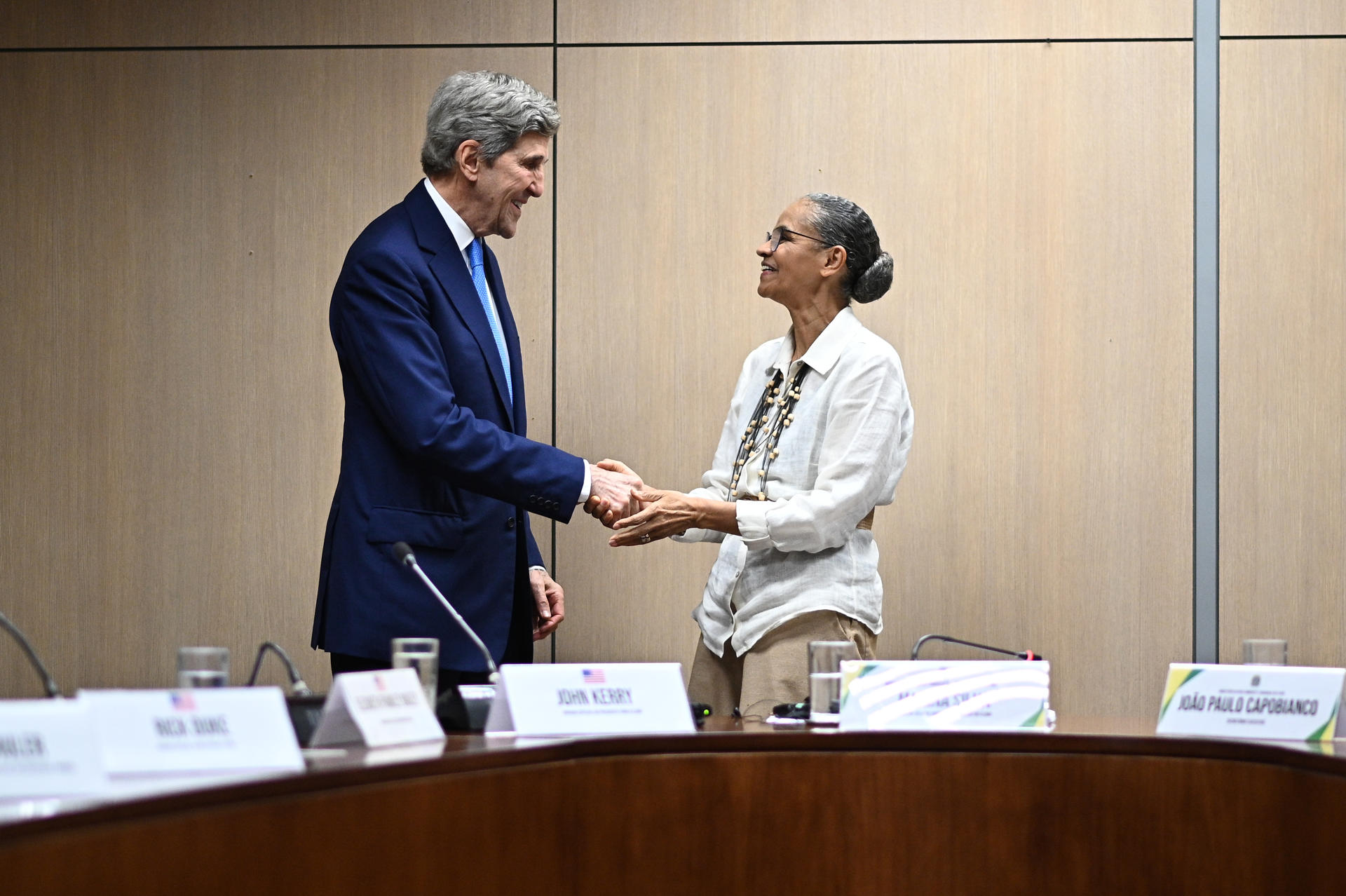 Marina disse que o governo Lula tem compromisso de zerar o desmatamento na região até 2030, mas disse a Kerry que a Amazônia pertence ao Brasil. "Entendemos o caráter que a Amazônia tem sobre o equilíbrio do planeta, mas temos a clareza da soberania sobre esse território", afirmou em entrevista coletiva nesta terça-feira (28). Kerry estava ao seu lado e assentiu com a cabeça.