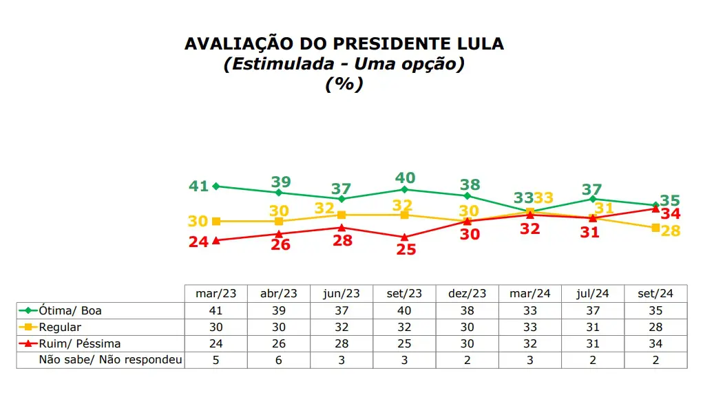 A avaliação negativa do governo do presidente Luiz Inácio Lula da Silva (PT) cresceu neste mês de setembro de acordo com a mais recente pesquisa divulgada pelo Ipec. O levantamento mostra que avaliação como ruim ou péssima teve ganhos entre os que consideravam como ótimo/bom e regular, que caíram.