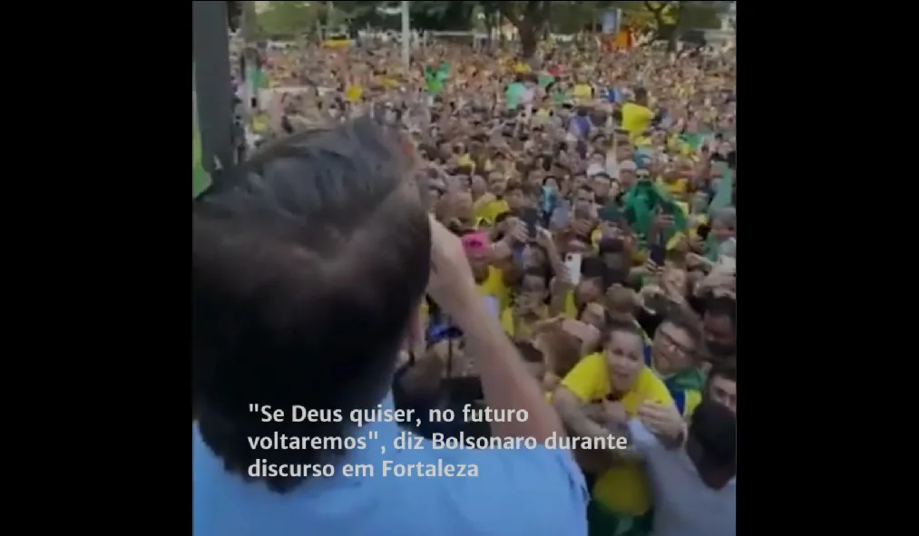 Em cima de um trio elétrico e cercado de uma multidão vestida de verde amarelo, o ex-presidente Jair Bolsonaro agradeceu a todos e a Deus pela sobrevivência à facada e pelos quatro anos como chefe do Executivo, neste sábado (30) em Fortaleza-CE. Ao final, Bolsonaro completou dizendo que “Se Deus quiser, se essa for a vontade dele, no futuro nós voltaremos”.