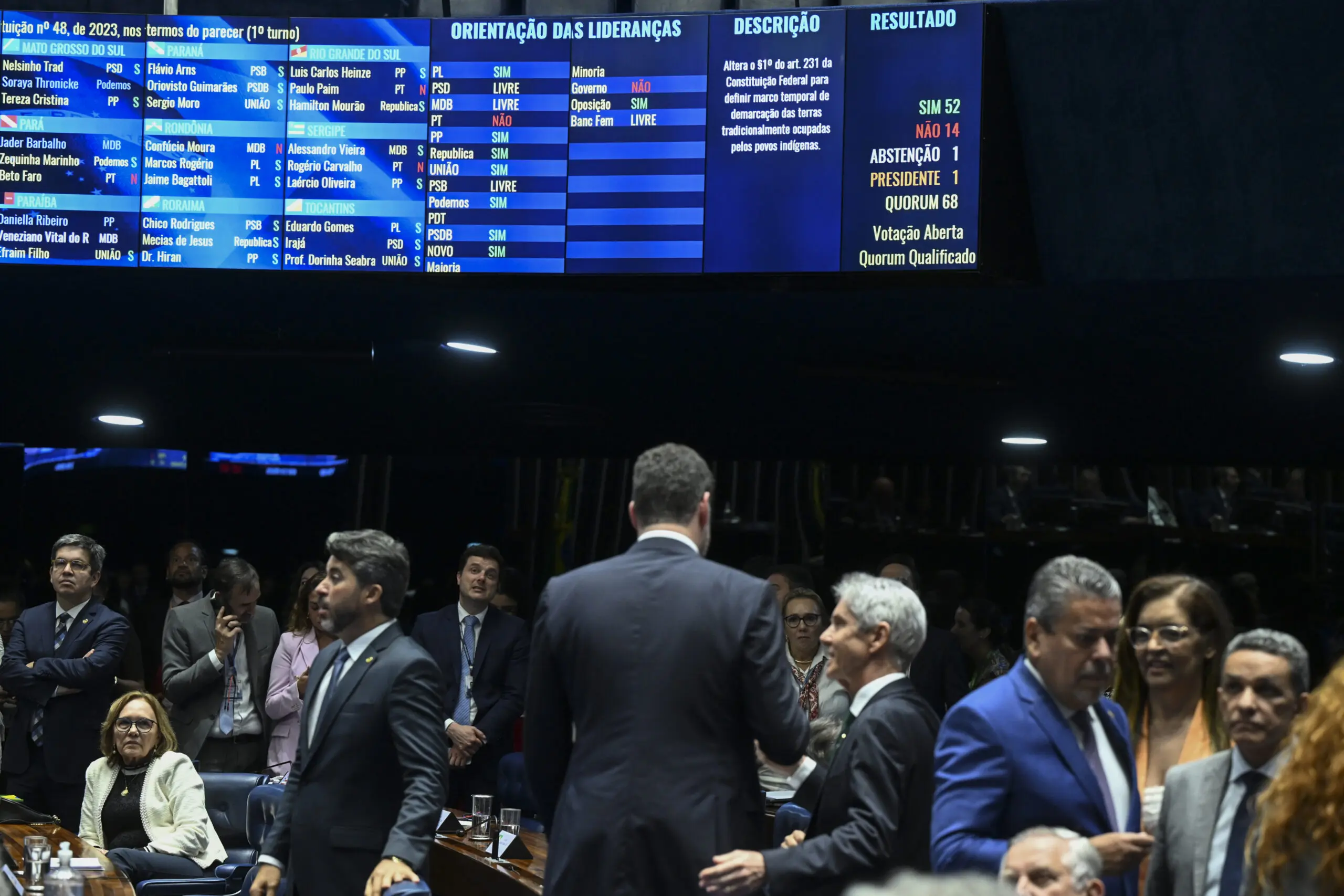O Senado Federal aprovou nesta terça-feira (9) a Proposta de Emenda Constitucional (PEC) 48/2023, que insere o marco temporal na Constituição e limita a demarcação de terras indígenas às áreas ocupadas antes de 1988, data da promulgação da Constituição Federal.
