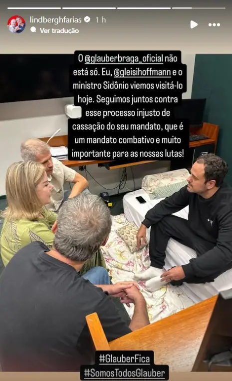 A ministra Gleisi Hoffmann (PT-PR), das Relações Institucionais, o ministro Sidônio Palmeira, da Secretária de Comunicação, e o líder do Partido dos Trabalhadores (PT) na Câmara dos Deputados, Lindbergh Farias (PT-RJ), visitaram Glauber Braga (PSOL-SP) neste sábado (12). O parlamentar está dormindo no Congresso Nacional desde que um parecer para cassar seu mandato foi aprovado em uma comissão da Casa.