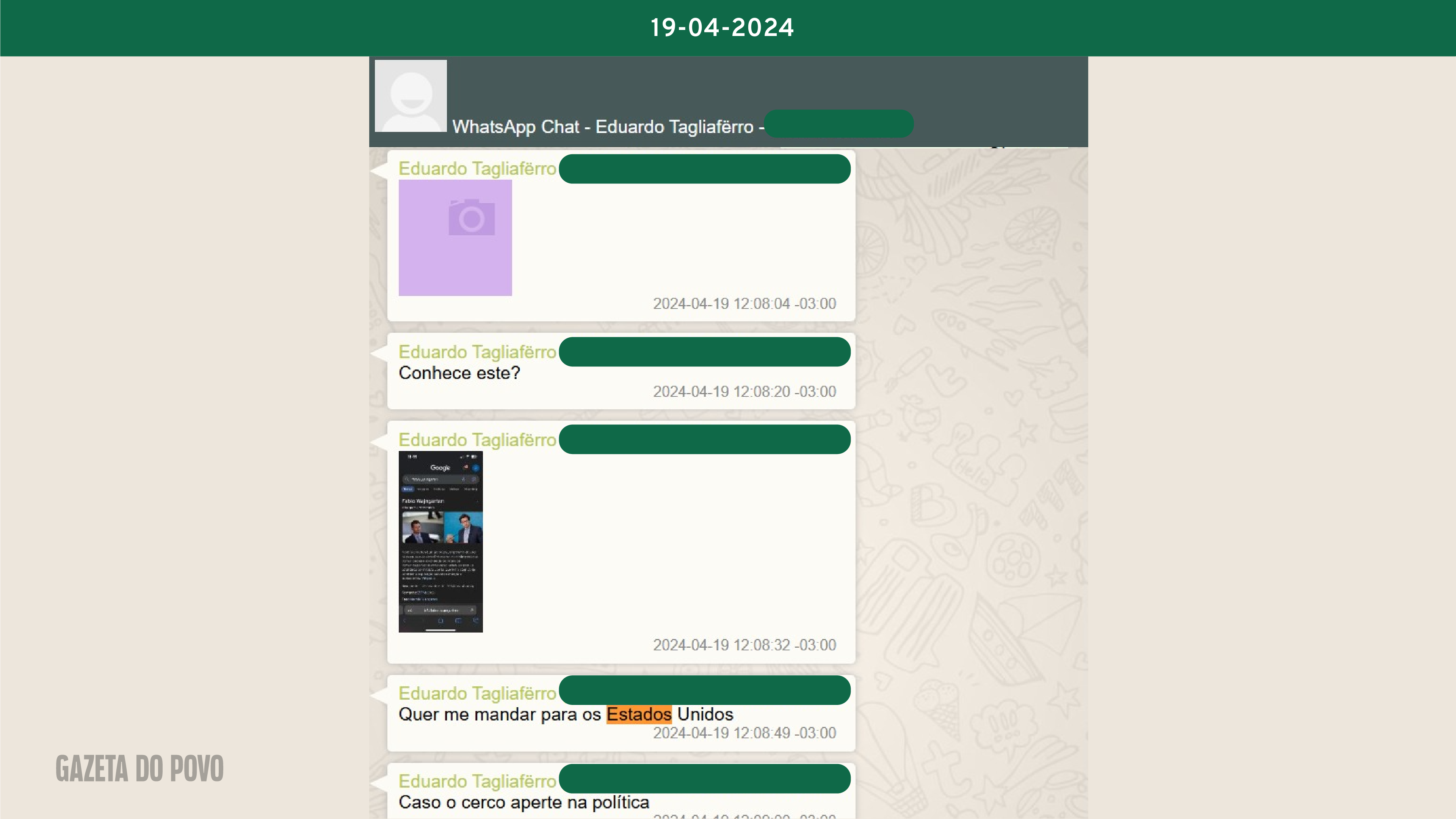Segundo as mensagens de WhatsApp acessadas pela Gazeta do Povo, no mesmo dia em que citou Wajngarten na conversa com a companheira, Tagliaferro retomou o assunto sobre ir aos Estados Unidos. Escreveu: "Já vou sair, meu advogado me chamou agora pouco por vídeo. Senado americano aprovou meu visto de residente anistiado, caso algo aconteça", diz mensagem enviada às 18h46.