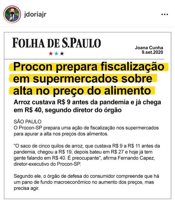 O preço de alguns alimentos subiu muito, no caso do arroz disparou. O foco da mídia recai sobre isso agora, o que é curioso, pois boa parte dela repetia, junto aos isolacionistas radicais, que o importante era a saúde, a vida, enquanto a economia podia ficar para depois. Parece que chegou o depois, até porque a taxa de contágio vem desabando mesmo com a reabertura e aglomerações. Valeria Scher tocou na ferida: