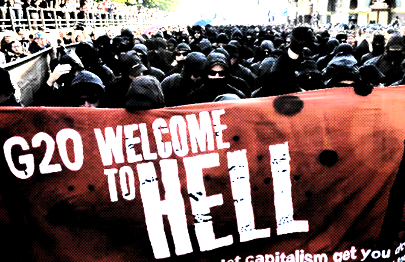“A polícia da Alemanha dispersou nesta quinta-feira (6) uma manifestação contrária à reunião do G20 em Hamburgo, na Alemanha. O tema do protesto, que é também usado como hashtag em redes sociais, era “Bem-vindos ao inferno” (#welcometohell). A polícia agiu quando um grupo de black blocs, mascarados e com roupas pretas, se misturou aos outros manifestantes. À frente da marcha, um grande cartaz pedia para “esmagar o G20” (“smash G20”). Ela foi convocada por uma autodenominada “aliança autônoma anticapitalista”.