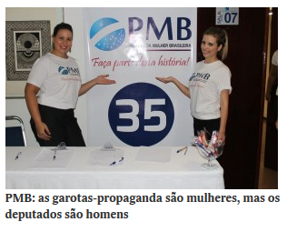 A situação é tão grotesca que o mais recente partido brasileiro, o PMB, ou Partido da Mulher Brasileira, que tem por objetivo defender os interesses específicos das mulheres, dos 21 deputados que possui, apenas 2, ou 10% da bancada, são mulheres.