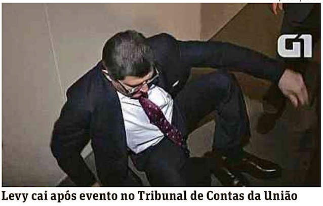 Joaquim Levy caiu. Literalmente. Ele sofreu uma queda durante um evento, indo parar no chão, como mostra a imagem: