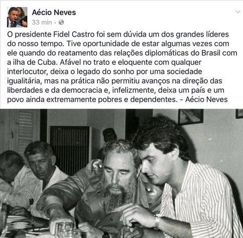 E a maior prova foi dada hoje. A morte do tirano Fidel Castro tem sido uma excelente oportunidade para separar o joio do trigo. Qualquer um que faça algum elogio a esse carniceiro do Caribe, que tente relativizar sua monstruosidade, dá atestado de canalhice. E Aécio escolheu o joio, o lado podre, dos bajuladores de um déspota cruel. Eis o que ele publicou em seu Facebook: