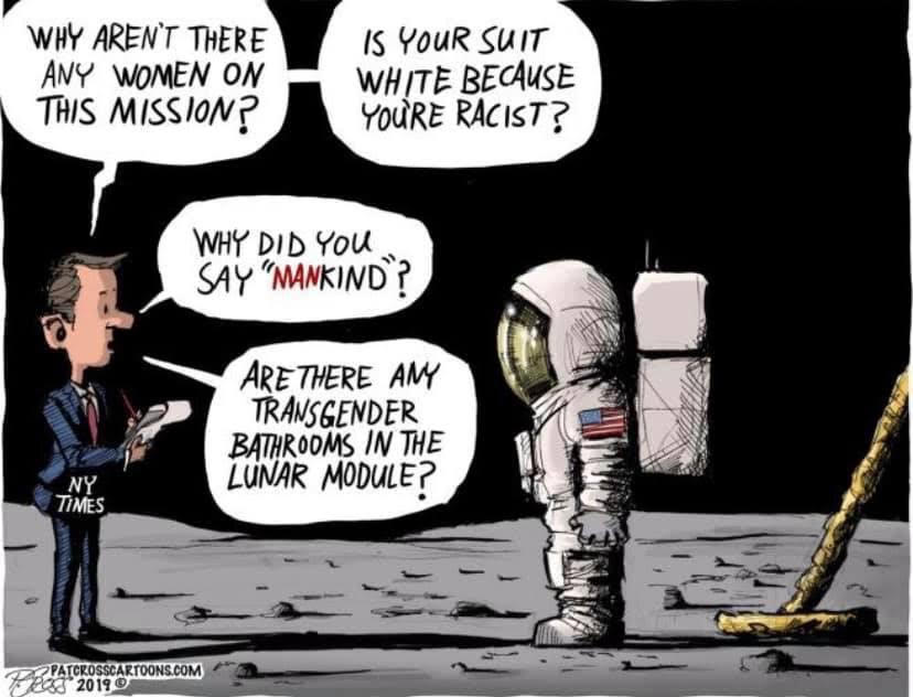 Diante dessa bizarrice só resta mesmo o humor. Uma charge que está circulando captura a essência da loucura que tomou conta da mídia e da esquerda, imaginando como seria uma entrevista com o astronauta que acaba de conquistar a sonhada viagem do homem (ops, da humanidade) à Lua: