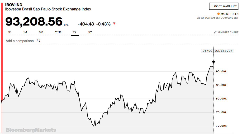 O presidente Jair Bolsonaro, nesta quarta, usou a rede social para destacar a tendência de alta do Ibovespa, principal índice de ações brasileiras, que atingiu sua máxima histórica. Ele apontou para o grau de otimismo dos investidores com o novo governo: