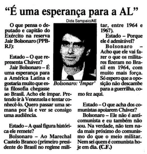 Está circulando pelas redes sociais uma entrevista de Jair Bolsonaro ao Estadão em 1999, em que o capitão elogia ninguém menos do que Hugo Chávez, o troglodita socialista que destruiu a Venezuela. Leitores me cobram algum comentário, e é justo. Claro que tenho meus dois cents para oferecer sobre o assunto.