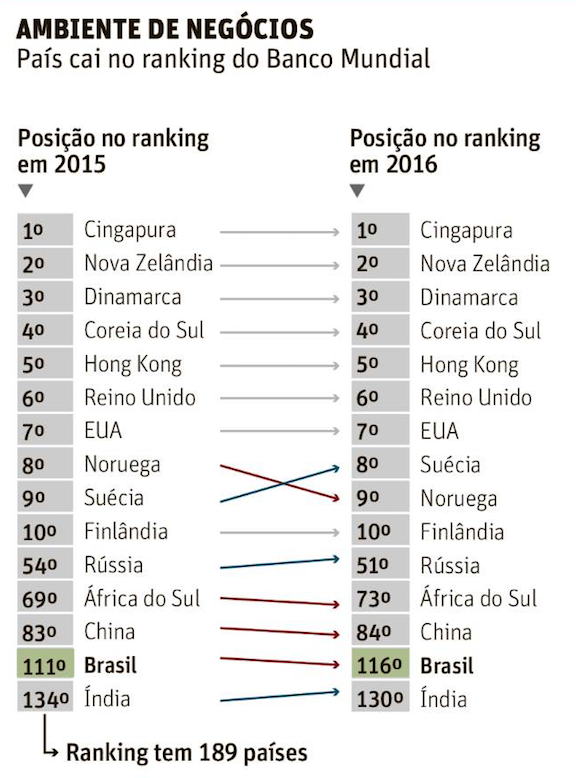 O Brasil manteve uma colocação ruim no ranking anual do Banco Mundial sobre ambiente de negócios, divulgado nesta terça (27), ficando em 116º lugar. O levantamento engloba 189 países.