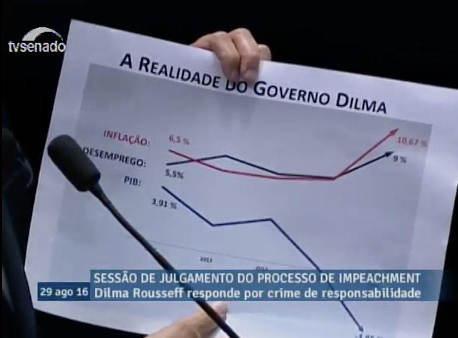 Durante sua pergunta na sessão extraordinária de julgamento do impeachment de Dilma Rousseff, o senador Ronaldo Caiado expôs um gráfico que mostra, em uma só imagem, a desgraça que o governo petista causou ao país: