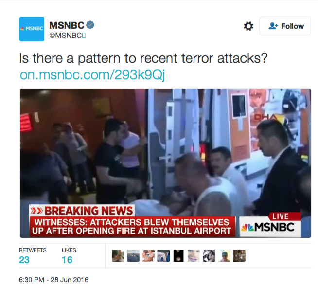 Não, MSNBC, não há padrão algum, nenhum denominador comum nesses ataques. Pode ser a homofobia, pode ser culpa das armas, pode ser o passado colonialista ocidental, pode ser culpa do Trump. Só não vamos fazer uma associação desses atentados com o Islã, ignorando o fato de que são todos muçulmanos que se explodem e matam em nome de Alá, pois isso não é permitido no mundo moderno.