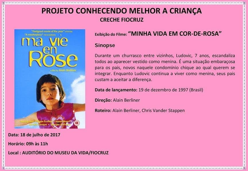A Creche Fiocruz convida os responsáveis pelas crianças, alunos do curso de Educador Infantil e demais trabalhadores da instituição com interesse no tema para a exibição do filme “Minha vida em cor-de-rosa”, que aborda a questão de infância e gênero, e ocorrerá no auditório do Museu da Vida, nesta terça-feira (18/7), de 9 as 11 horas. O filme foi lançado em 1997 com direção do cineasta belga Alain Berliner. Confira abaixo a imagem com mais informações sobre a sessão: