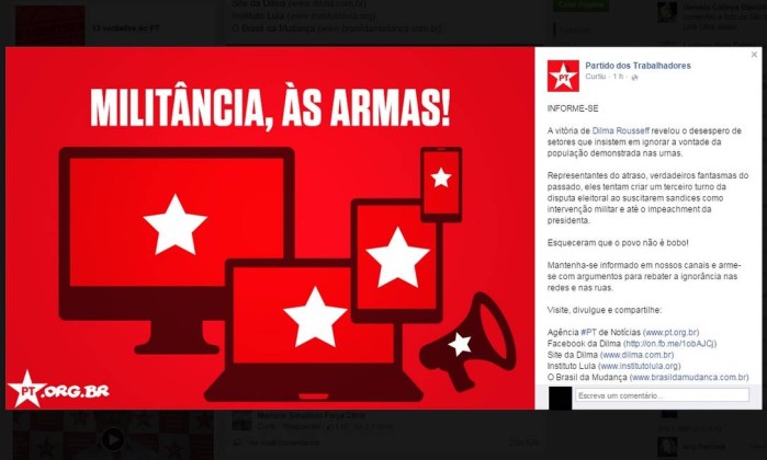 A campanha, colocada nas redes sociais da legenda na manhã desta terça-feira. A mensagem postada com o título “Militância, às armas” no perfil oficial do Partidos dos Trabalhadores no Facebook afirma que a vitória da presidente Dilma Rousseff “revelou o desespero de setores que insistem em ignorar a vontade da população”. E que os “representantes do atraso” estariam tentando manter o acirramento para desestabilizar o segundo mandato da presidente reeleita no último dia 26 de outubro com 51,64% dos votos.