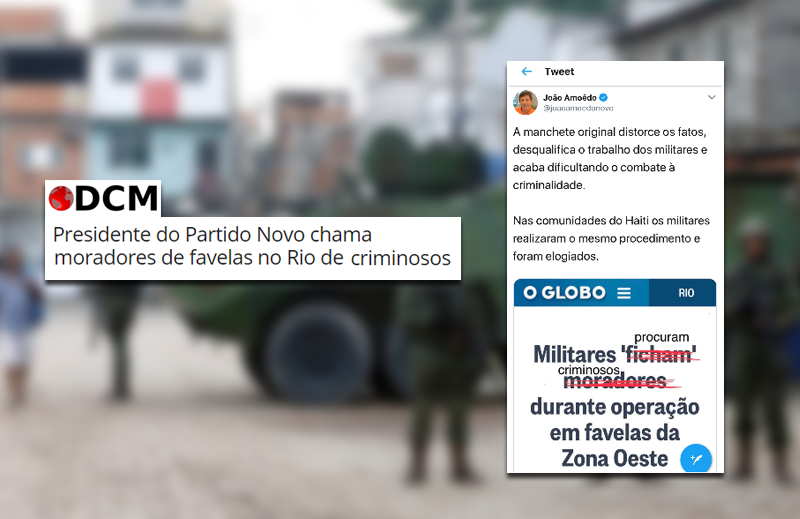 Em sua página pessoal, Amoêdo fez uma arte replicando a manchete, mas riscando as palavras “‘ficham’ moradores” e substituindo por “procuram criminosos”. Ou seja, a manchete ficaria “Militares procuram criminosos durante operação em favelas da Zona Oeste”. Ele comentou: “A manchete original distorce os fatos, desqualifica o trabalho dos militares e acaba dificultando o combate à criminalidade. Nas comunidades do Haiti, os militares realizaram o mesmo procedimento e foram aplaudidos”.