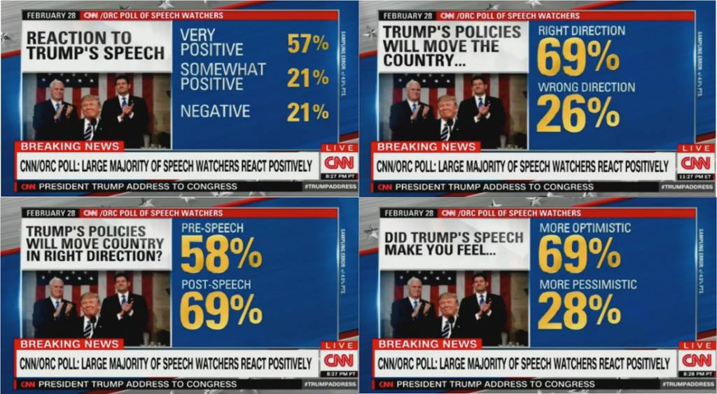 Mas voltando: vi Trump fazer seu belo discurso pela CNN. Queria ver a reação da turma na “Clinton News Network”. Supresa! Até mesmo os apresentadores da esquerdista CNN tiveram que reconhecer o sucesso do primeiro discurso ao Congresso, que mereceu aplausos de ambos os lados em vários momentos (o ponto alto tendo sido a homenagem à viúva de um fuzileiro naval morto recentemente, que foi às lágrimas sendo ovacionada por quase todos – alguns democratas, vergonhosamente, permaneceram sentados sem aplaudir).