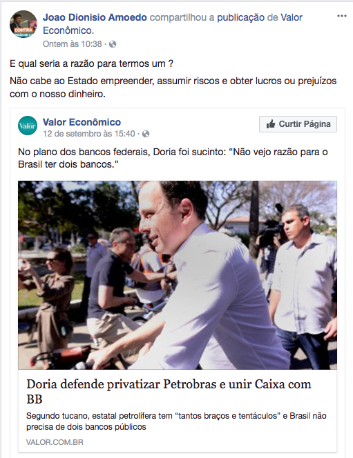 Mas ainda falta mais vontade, mais convicção liberal. A Petrobras não tem que ser privatizada gradualmente: tem que ser retirada do controle estatal já! E se Doria não vê razão para o Brasil ter dois bancos estatais (na verdade três, pois ele ignora o BNDES), cabe perguntar: e enxerga razão para ter UM? Por quê? Por que o governo deveria ser banqueiro? João Dionísio Amoedo, do Partido Novo, cobrou a mesma resposta do tucano: