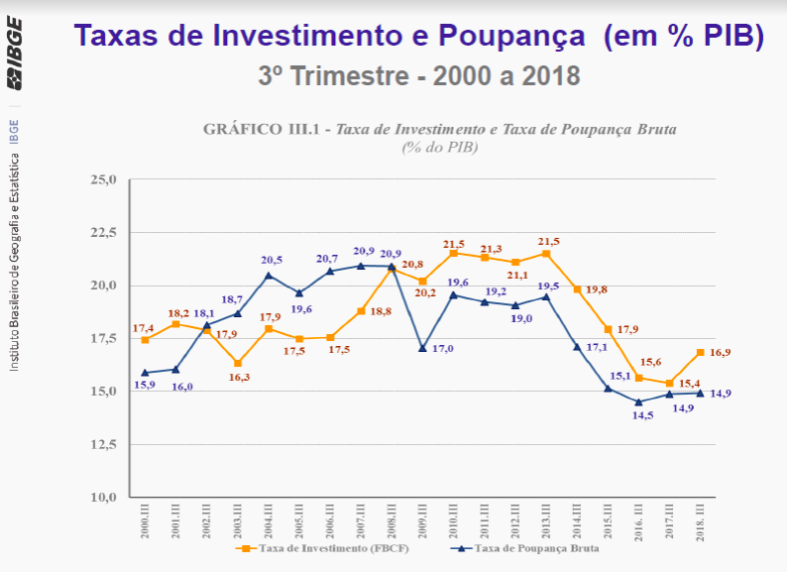2 – A taxa de poupança bruta no terceiro trimestre de 2018 foi de 14,9% do PIB. No terceiro trimestre de 2009 foi de 20,9% do PIB. Redução de 28,71% em relação ao PIB em nove anos.