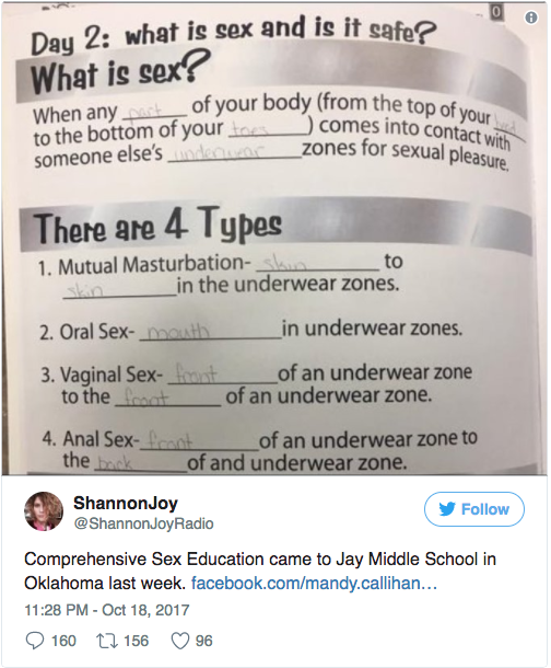 A mãe ficou indignada: “Minha filha de 12 anos ainda desenha em livros de colorir”. Ela desabafou: “Numa sala onde há meninos e meninas, com instrutores homens que não são professores”. Sua revolta foi ampliada pelo fato de que a escola nada disse sobre isso, não avisou aos pais que seus filhos aprenderiam sobre masturbação mútua ou sexo anal.