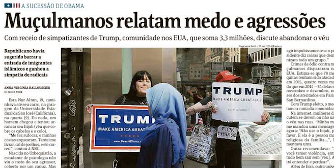 Vejam a Folha de SP hoje, por exemplo. No caderno “mundo”, usou uma página inteira para mostrar muçulmanas com medo de represálias, e uma brasileira que teria sido alvo de “xenofobia”: