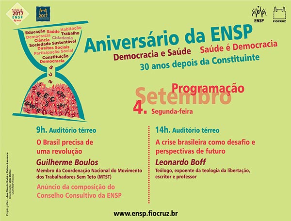 Na segunda-feira, 4 de setembro, a Escola Nacional de Saúde Pública Sergio Arouca (ENSP/Fiocruz) iniciará as atividades comemorativas de 63 anos de luta pela universalização da saúde pública no país. Com o tema, Democracia e Saúde. Saúde é Democracia, a ENSP debaterá o cenário nacional trinta anos após a Constituinte. No primeiro dia (4/9), às 9 horas, no auditório térreo, a cerimônia abertura terá presença do diretor Hermano Castro, da diretora do Sindicato dos Servidores da Fiocruz (Asfoc-SN), Justa Helena, e de um representante da presidência da Fiocruz. Logo depois, a Escola anunciará a composição do Conselho Consultivo, seguida da palestra O Brasil precisa de uma revolução, a ser proferida pelo membro da Coordenação Nacional do Movimento dos Trabalhadores Sem Teto (MTST) Guilherme Boulos. Às 14 horas, as comemorações continuam com a palestra do teólogo e escritor Leonardo Boff, que falará sobre A crise brasileira como desafio e perspectivas de futuro.