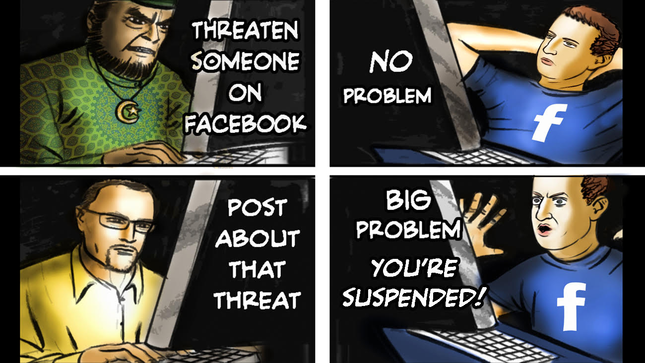 A turma do FrontPage Mag, que tece críticas frequentes ao Islã, vive sendo bloqueada também. O caso mais recente foi bizarro: seu editor foi punido por divulgar a ameaça de violência que recebeu de um muçulmano. Ou seja, a própria ameaça foi permitida, mas divulga-la foi a gota d’água: onde já se viu retratar um muçulmano, adepto da “religião da paz”, dessa forma tão “pejorativa”? A revista ironizou, em texto que brinca com o nome da rede social, que seria “duas caras”: