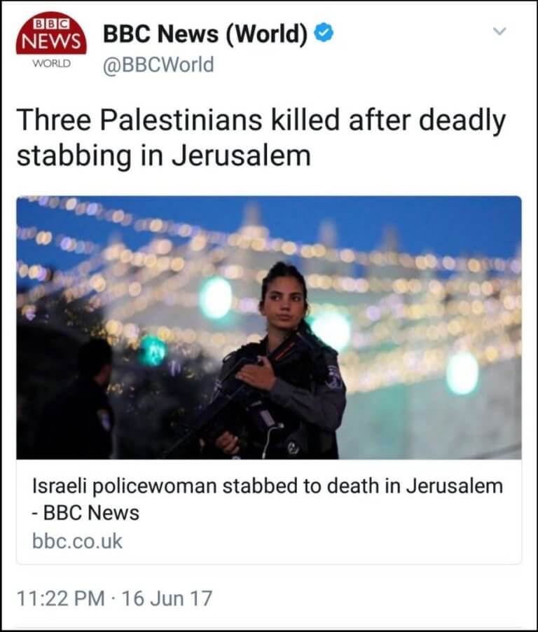 O título chocante da BBC levava o público a pensar que os palestinos foram esfaqueados. A única certeza que dava é que três palestinos haviam sido mortos – não que fossem terroristas que haviam acabado de assassinar um israelense e estavam tentando matar outros. Após intervenção, vejam só, do primeiro-ministro Netanyahu e do filho de Trump, a BBC mudou sua manchete e deletou o tweet original, mas a questão permanece: por que o caso foi reportado daquela forma em primeiro lugar?