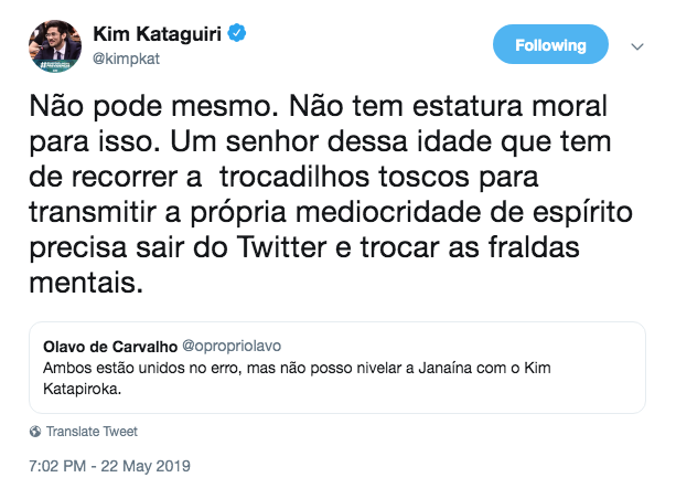 O guru dessa seita, aliás, prometeu ficar quieto, mas não consegue, e continua atacando tudo e todos. Faz campanha aberta contra o MBL, tenta ridicularizar até a qualidade musical de Lobão, e cria apelidos pejorativos para desafetos, como fez com Kim Kataguiri, um dos deputados que mais lutam pela reforma previdenciária no Congresso. Recebeu a resposta que merecia: