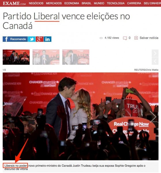 Quem venceu as eleições no Canadá foi a esquerda e é um erro absurdo escrever “liberais no poder”, como nessa matéria. É como se o tradutor não soubesse que “football” por lá é um jogo que se joga com bola oval e usando as mãos. Justin Trudeau, o novo primeiro-ministro eleito, é tão esquerdista quanto Barack Obama.