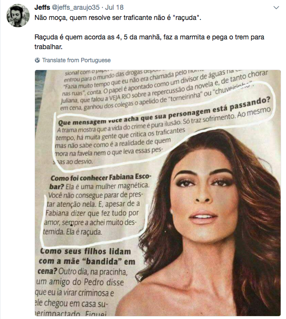 Quando é para elogiar, eu elogio, como fiz aqui, quando a atriz Juliana Paes desafiou a patrulha para defender o feminino em vez de o feminismo. Mas se for para criticar, eu critico também. E, dessa vez, Juliana Paes escorregou feio. Foi falar de sua personagem na novela, uma mulher disposta a tudo para ajudar o marido preso por tráfico, até mesmo a se tornar uma traficante também. E deu a entender que sente certa admiração pela figura real que inspirou a personagem. Levou uma boa resposta: