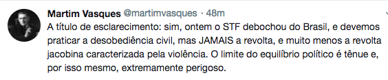 A decisão do STF nesta quinta foi uma ducha de água fria em todos os brasileiros que tinham esperança na Justiça. E foi, também, um galão de gasolina na fogueira, ao incendiar o sentimento geral de que acreditar nas instituições já deu, é ingenuidade, que “algo” fora disso precisa ser feito. O clima é de “desobediência civil”, e eu mesmo cheguei a confessar que dou o braço a torcer: precisamos agora mais de Thomas Paine, o revolucionário, do que de Edmund Burke, o prudente.