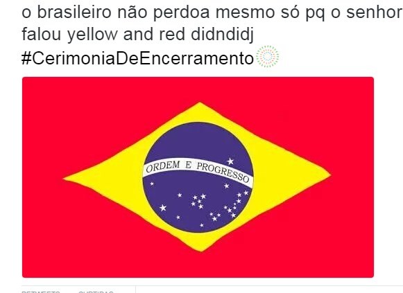 Durante discurso de encerramento, o presidente do Comitê Olímpico Brasileiro, Carlos Arthur Nuzman, trocou as bolas e disse que as cores da bandeira brasileira eram amarela e vermelha (“yellow and red”). Durante fala, Nuzman quis dizer que “Vocês coloriram de verde e amarelo, e renovaram em nossos corações o orgulho e a autoestima de ser brasileiro”.