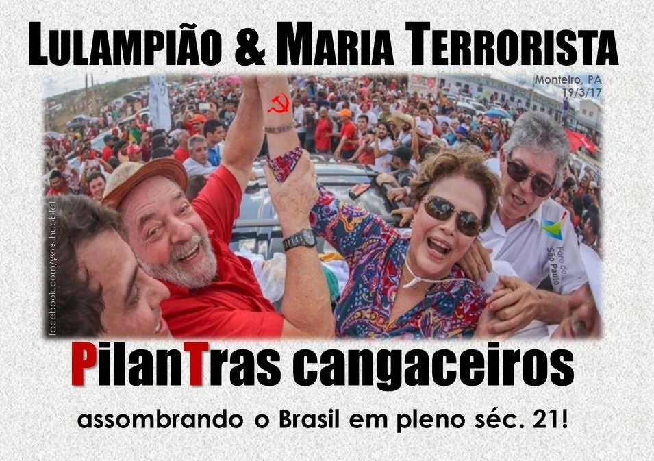 Vc ficou sabendo aí nos USA o q os criminosos Lulampião & Maria Terrorista fizeram ontem na Paraíba? Um comício totalmente ILEGAL, que “inaugurou” uma obra JÁ inaugurada, feito com a ajuda do criminoso que “governa” a Paraíba… e com dinheiro público para levar e pagar o “povão gado” para fazer volume! Tudo isso foi feito para usar de escudo contra uma provável prisão dos dois néscios por parte da Lava Jato [será?]… tipo “olha, o juiz Moro da direita quer calar o papai e a mamãe dos pobres!”… Se eu pudesse ia embora aí pros USA… o Brasil cansa – E ME ENOJA!